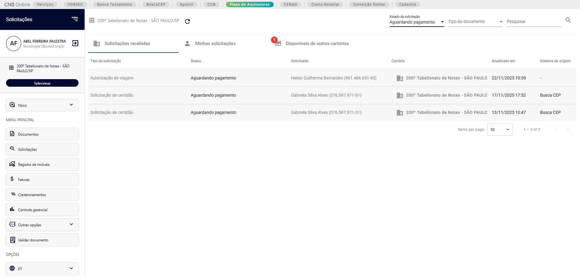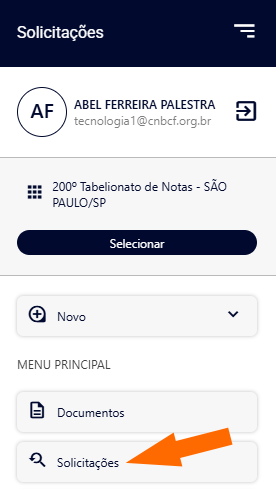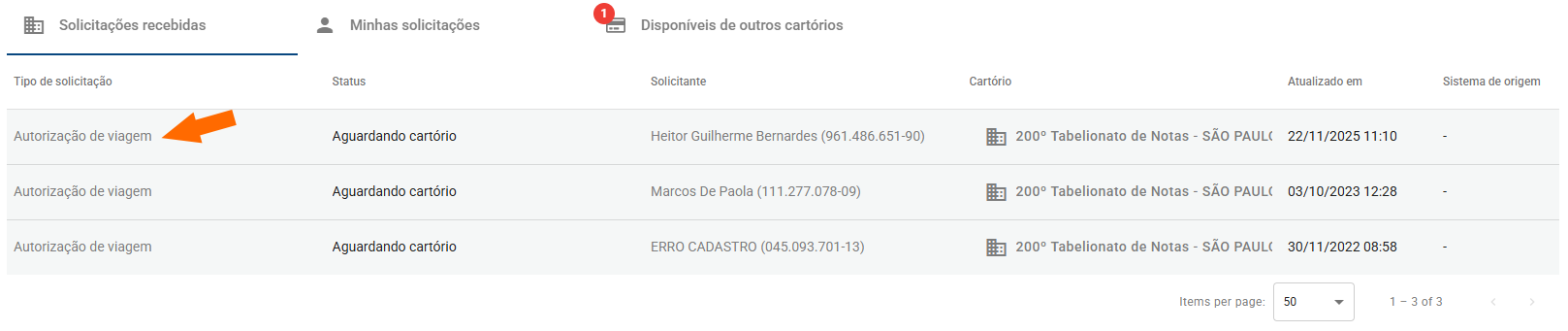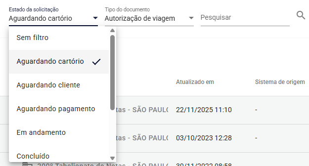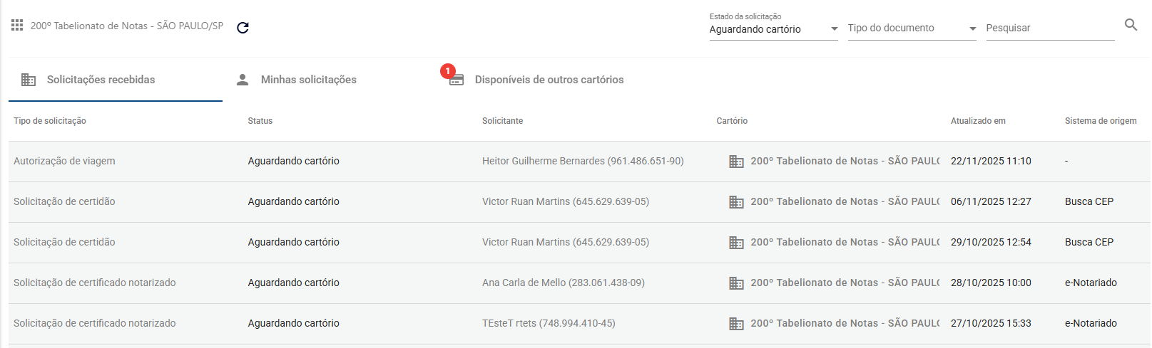 Serão listadas todas as solicitações que o cartório deverá atuar. Por padrão, são listadas as solicitações com o status 'aguardando cartório'.