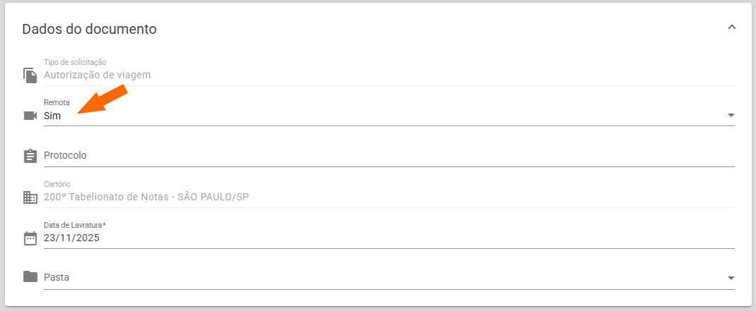Nos dados do documento, é possível alterar a forma de emissão (remota ou presencial), além da data do ato, e vinculá-lo a uma pasta para organização do cartório.