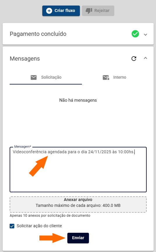 A qualquer momento, você poderá trocar mensagens com o solicitante, inclusive anexar arquivos, se necessário. Sempre que enviar uma mensagem, o cliente receberá uma notificação por e-mail.