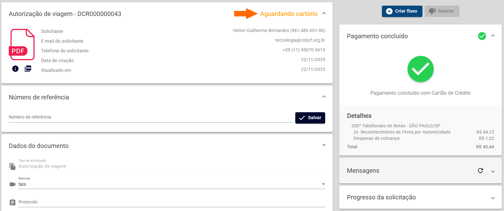 Se o atendimento da solicitação ainda não foi iniciado, o status estará 'Aguardando cartório'.