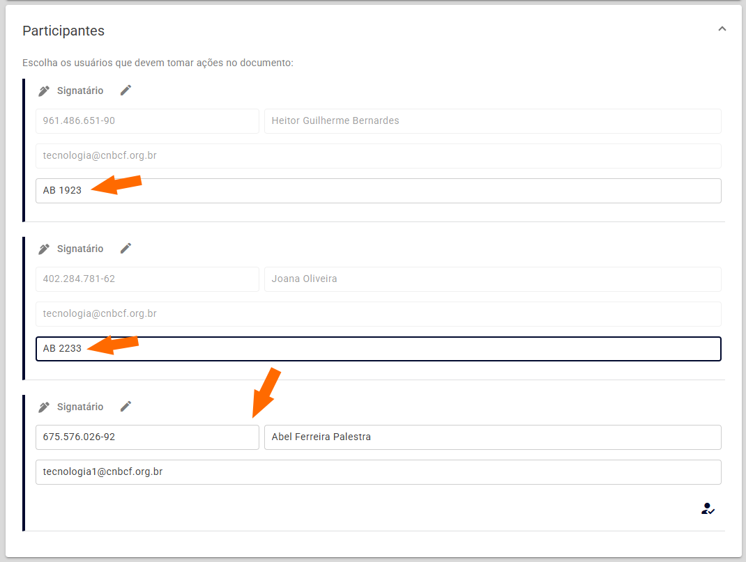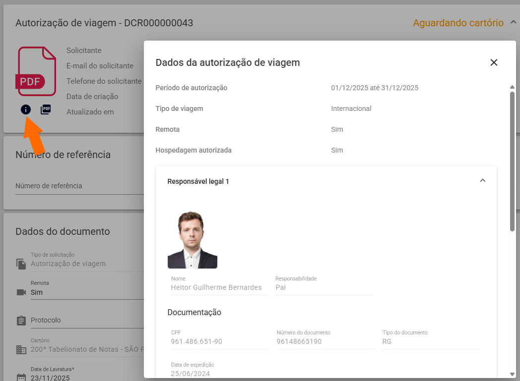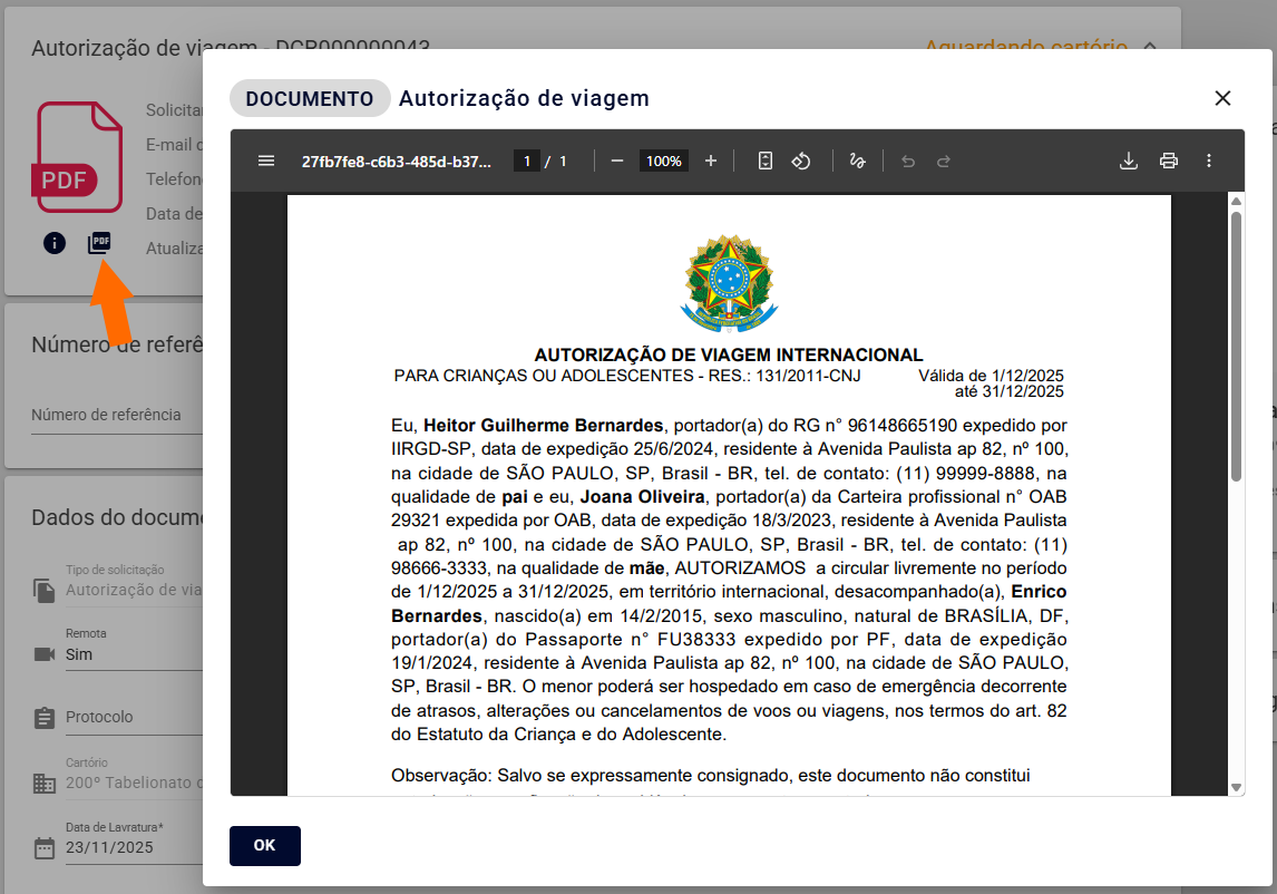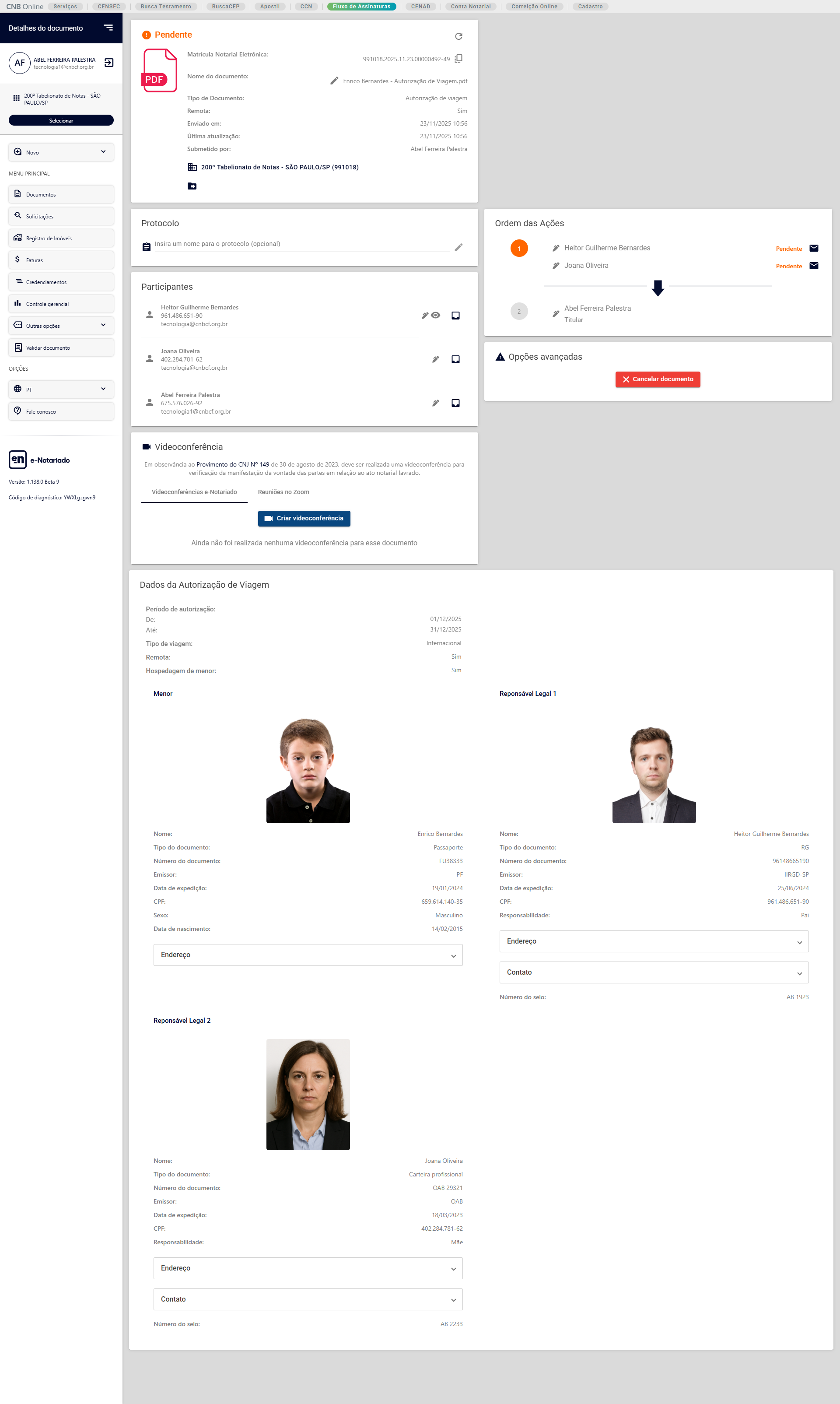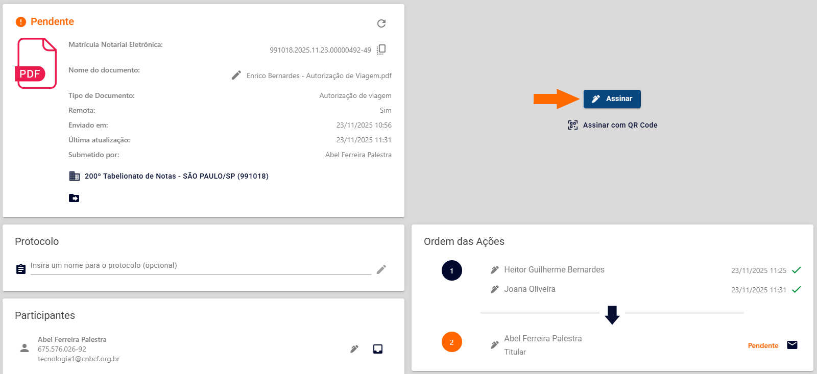 Os responsáveis pelo menor, que serão reconhecidos por autenticidade pelo tabelião, já estarão listados como signatários no fluxo.