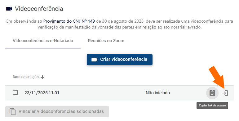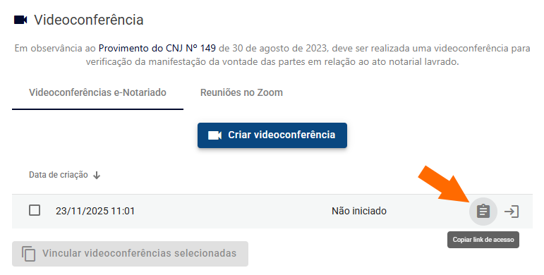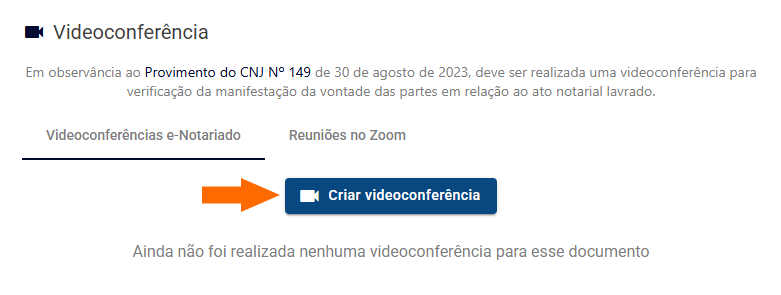 Se o tipo de emissão da AEV for remoto, efetue uma sessão de videoconferência com os responsáveis informados na AEV com o objetivo do reconhecimento por autenticidade. Para isto, clicar em 'Criar videoconferência'.