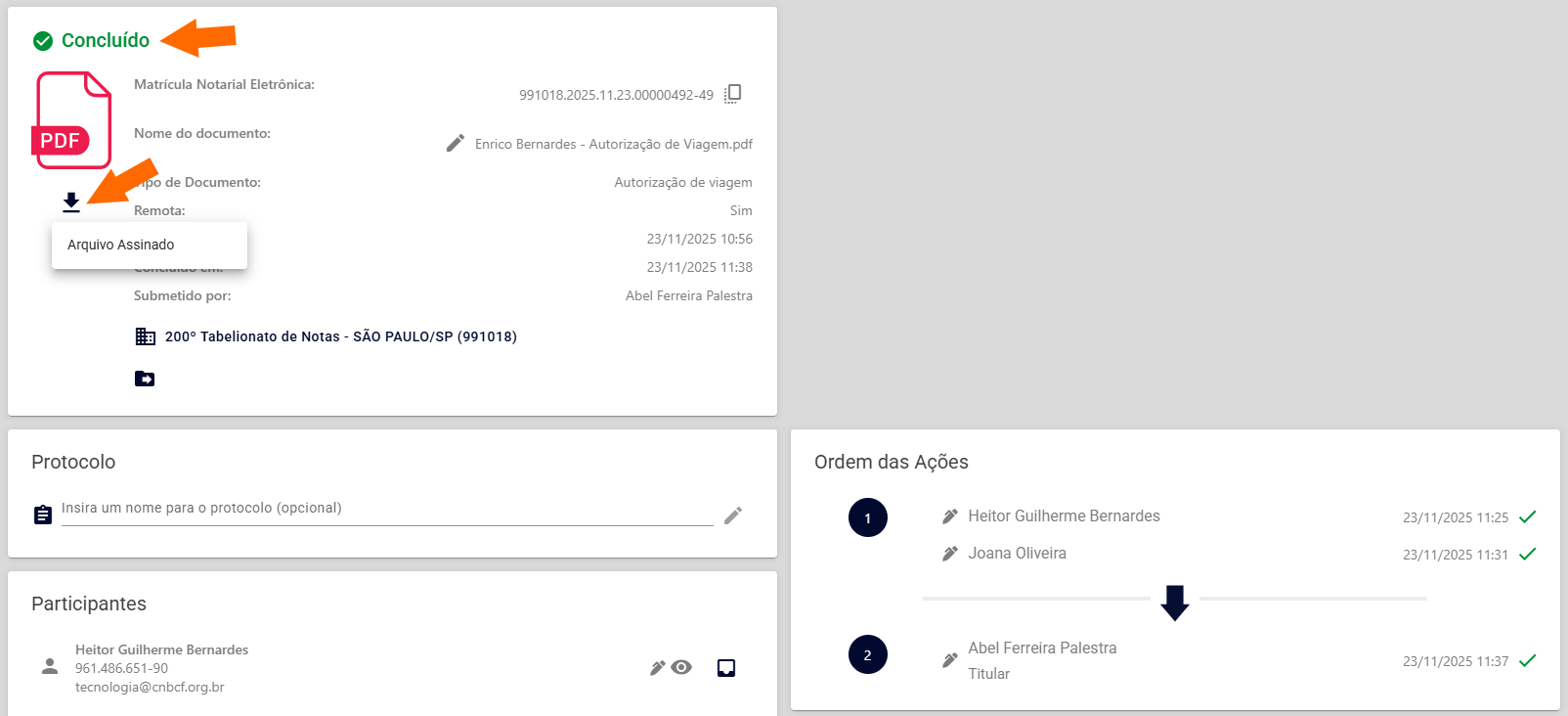 Assim que o notário assinar digitalmente a AEV, o fluxo de assinaturas será concluído, e a AEV assinada poderá ser acessada pelo solicitante diretamente no sistema. Além disso, o solicitante receberá um e-mail de notificação.