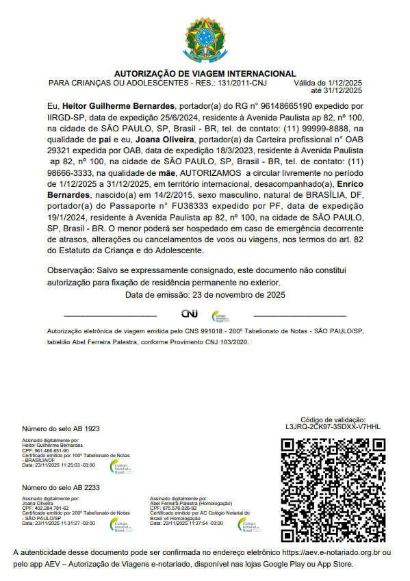 Recomendamos destacar aos responsáveis pelo menor as orientações para a validação da autenticidade da AEV, conforme instruções no rodapé deste documento.