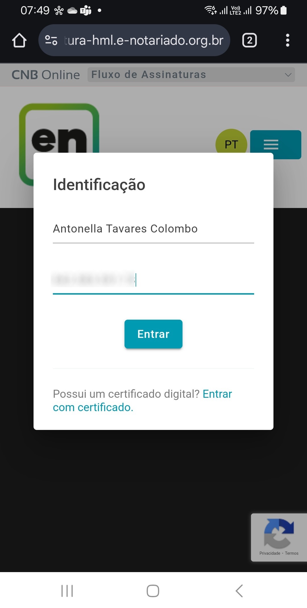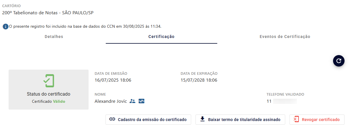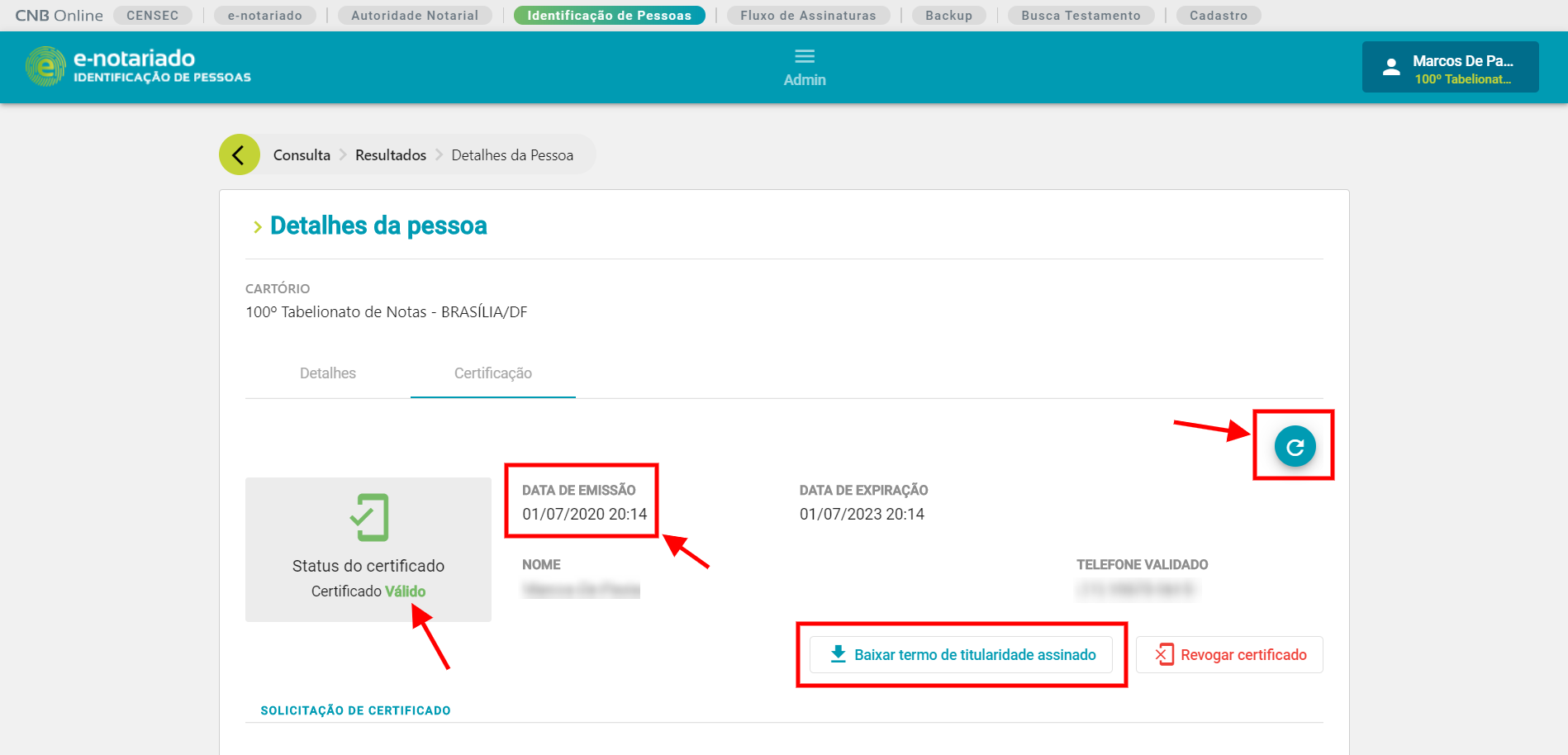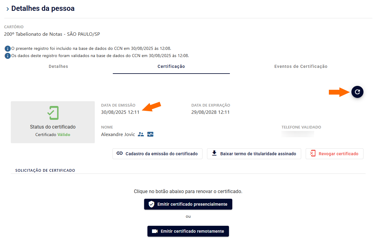 Clique no botão de Refresh para atualizar a tela e confirmar que o certificado foi emitido. O termo de titularidade assinado diretamente no celular da pessoa será também apresentado nesta tela, não sendo mais necessária sua impressão.