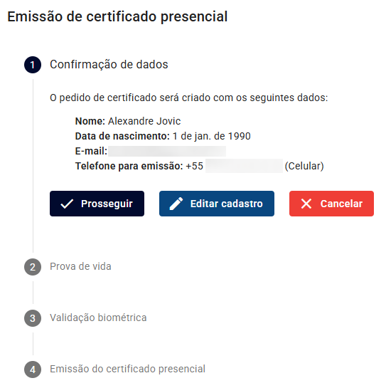 Na etapa 1, o sistema apresentará os dados de emissão do certificado. Se estiverem corretos, clique em "Prosseguir", caso contrário, clique em "Editar cadastro" para corrigir os dados lançados.
