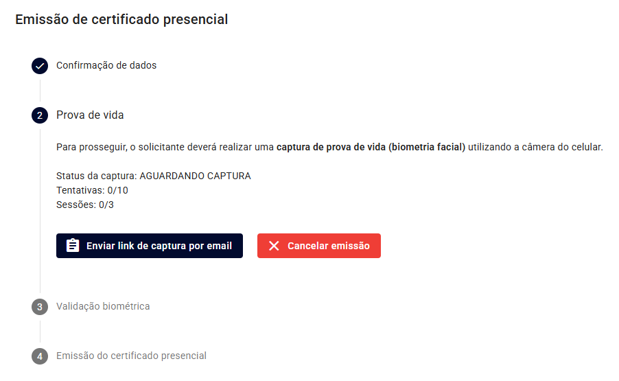 Caso o solicitante não consiga coletar a prova de vida em três tentativas, o cartório terá que reiniciar a emissão do certificado, criando um novo link da videoconferência para que o solicitante tente novamente.