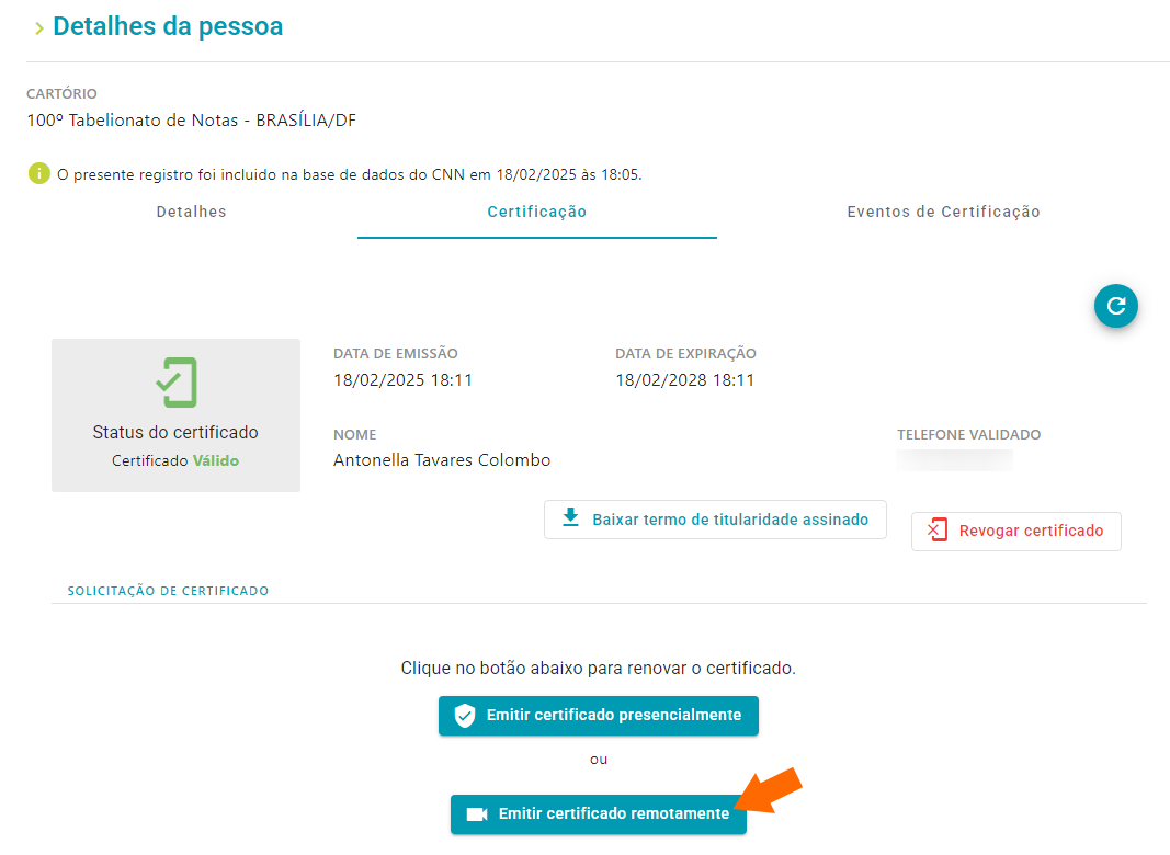 Observação: ao emitir um novo certificado digital para a pessoa, os emitidos anteriormente pelo cartório serão revogados automaticamente pelo sistema.