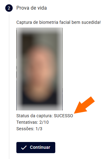 Quando o solicitante concluir a prova de vida com sucesso, será exibida a foto coletada acompanhada da indicação “SUCESSO”. Clique em "Continuar".