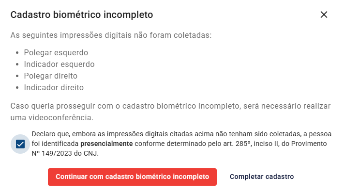 Na emissão presencial, é obrigatória a coleta das digitais da pessoa. Caso não seja possível coletar um dos dedos em razão de deficiência, registre o aceite de ciência do estabelecimento no Código de Normas do Extrajudicial e clique em “Continuar com cadastro biométrico incompleto”.