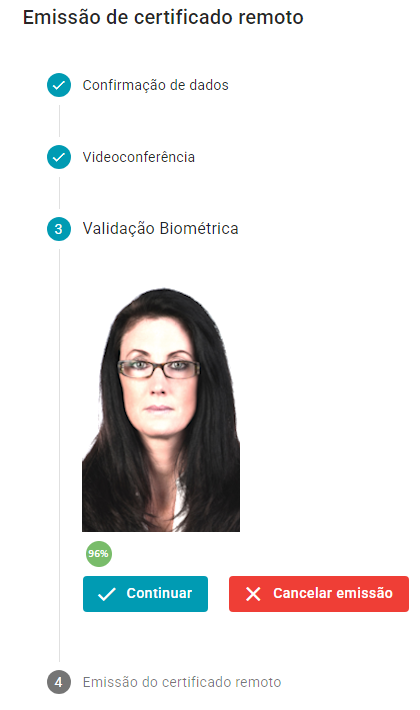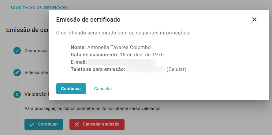 Clique em 'Continuar' para que o sistema efetue as validações biográficas e biométricas com a base nacional do CCN e/ou Datavalid.