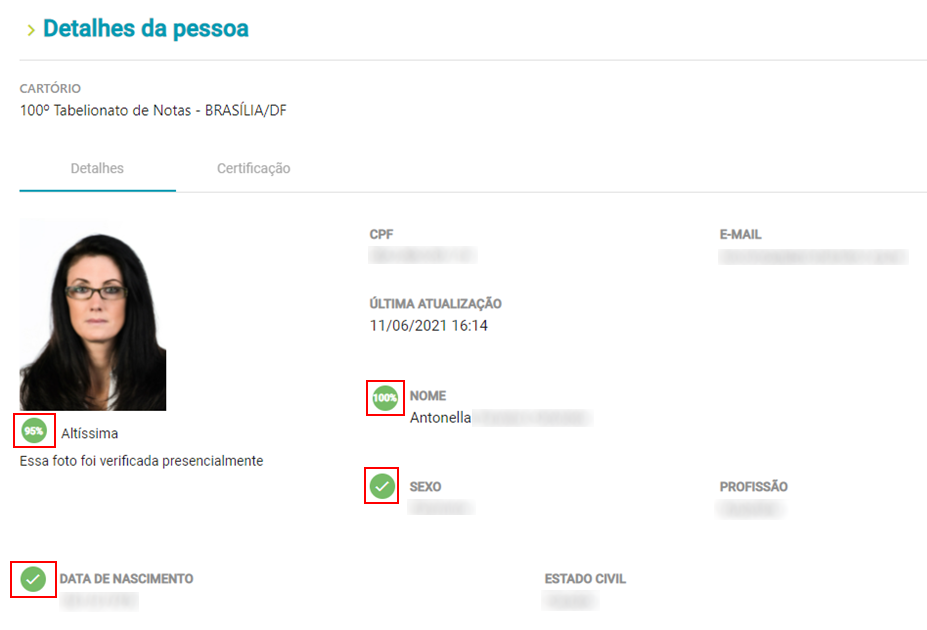 Para verificar todos os dados biográficos e biométricos validados, navegue até a aba 'Detalhes' e confirmar os percentuais de similaridade.