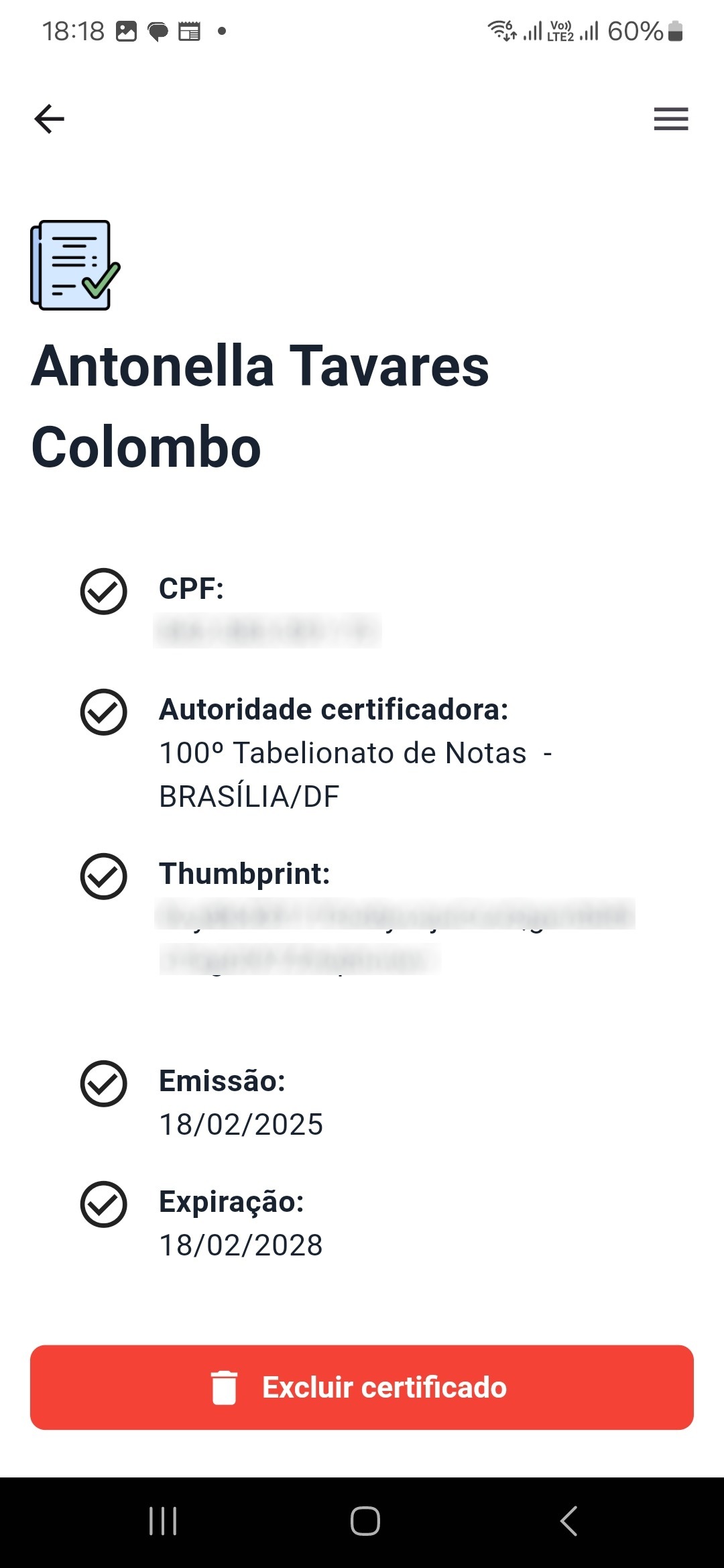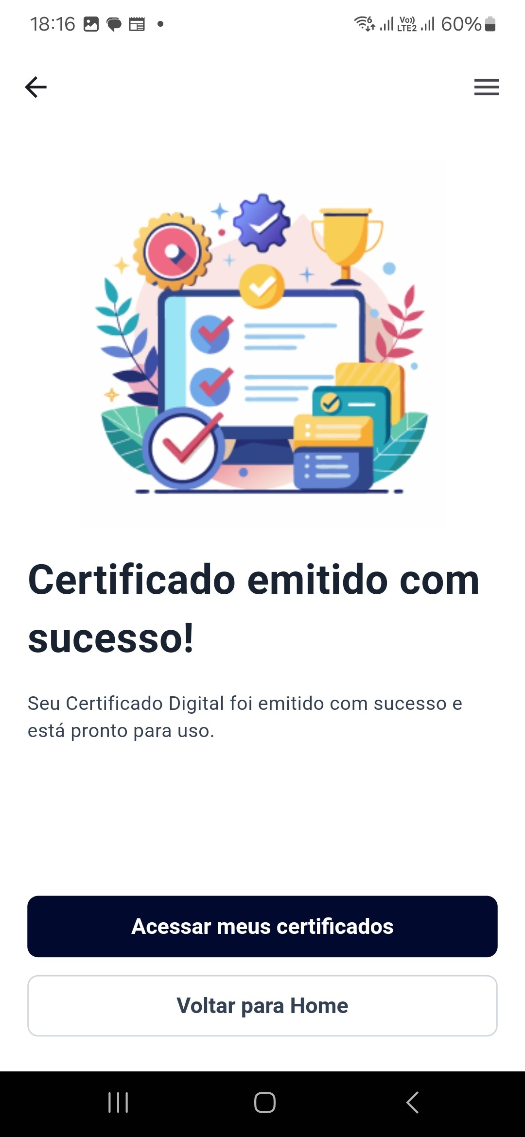 Após a emissão de certificado no celular do solicitante, clique no ícone de refresh para atualizar e consultar os dados da emissão.