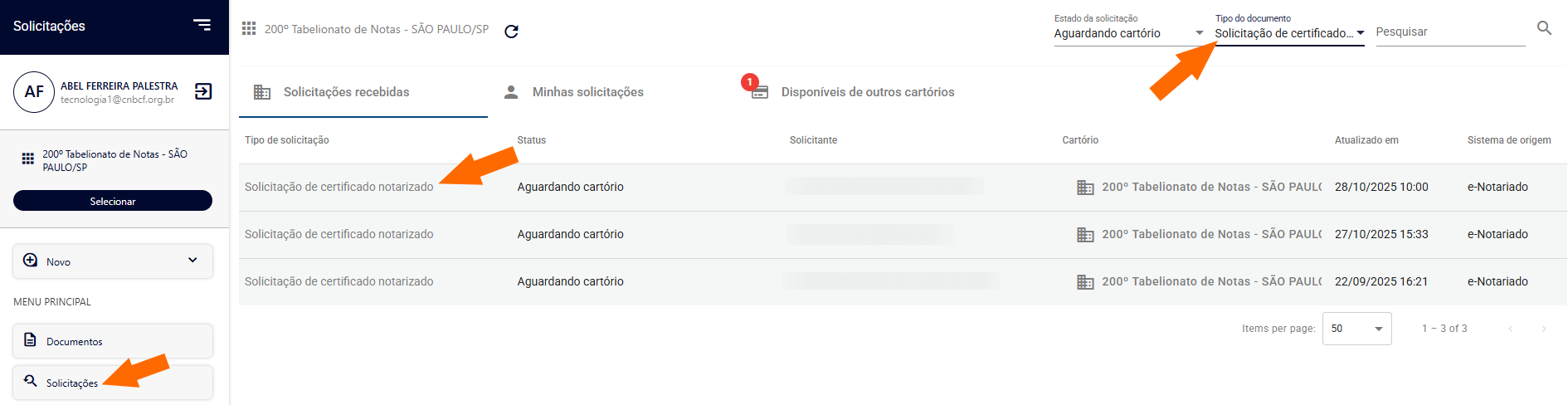 Acesse o Fluxo de Assinaturas e na opção 'Solicitações', confira as solicitações de certificados digitais criadas pelos clientes.