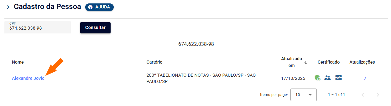 Serão relacionados os cadastros desse CPF em todos os cartórios de notas do Brasil. Clique sobre o Nome no cadastro do próprio cartório que irá emitir o certificado.