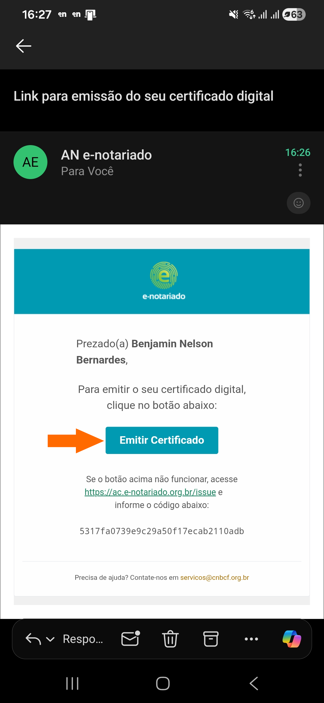 Acesse o e-mail enviado pelo cartório, conforme o modelo abaixo, e clique em 'Emitir Certificado'.