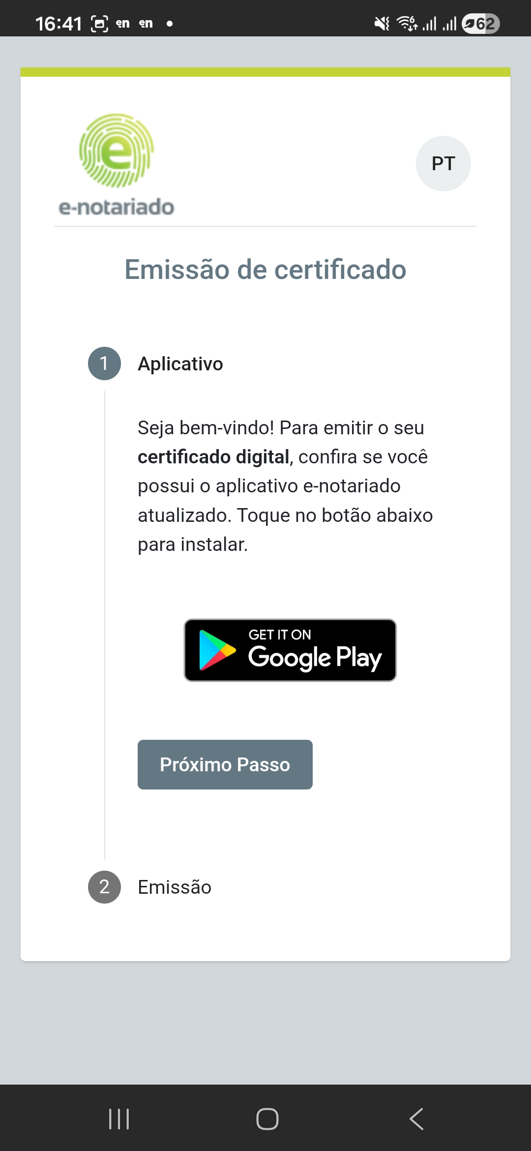 Se o aplicativo e-Notariado ainda não estiver instalado, clique em Google Play ou App Store para realizar o download e a instalação. Caso o aplicativo já esteja instalado, clique em ‘Próximo Passo’.”