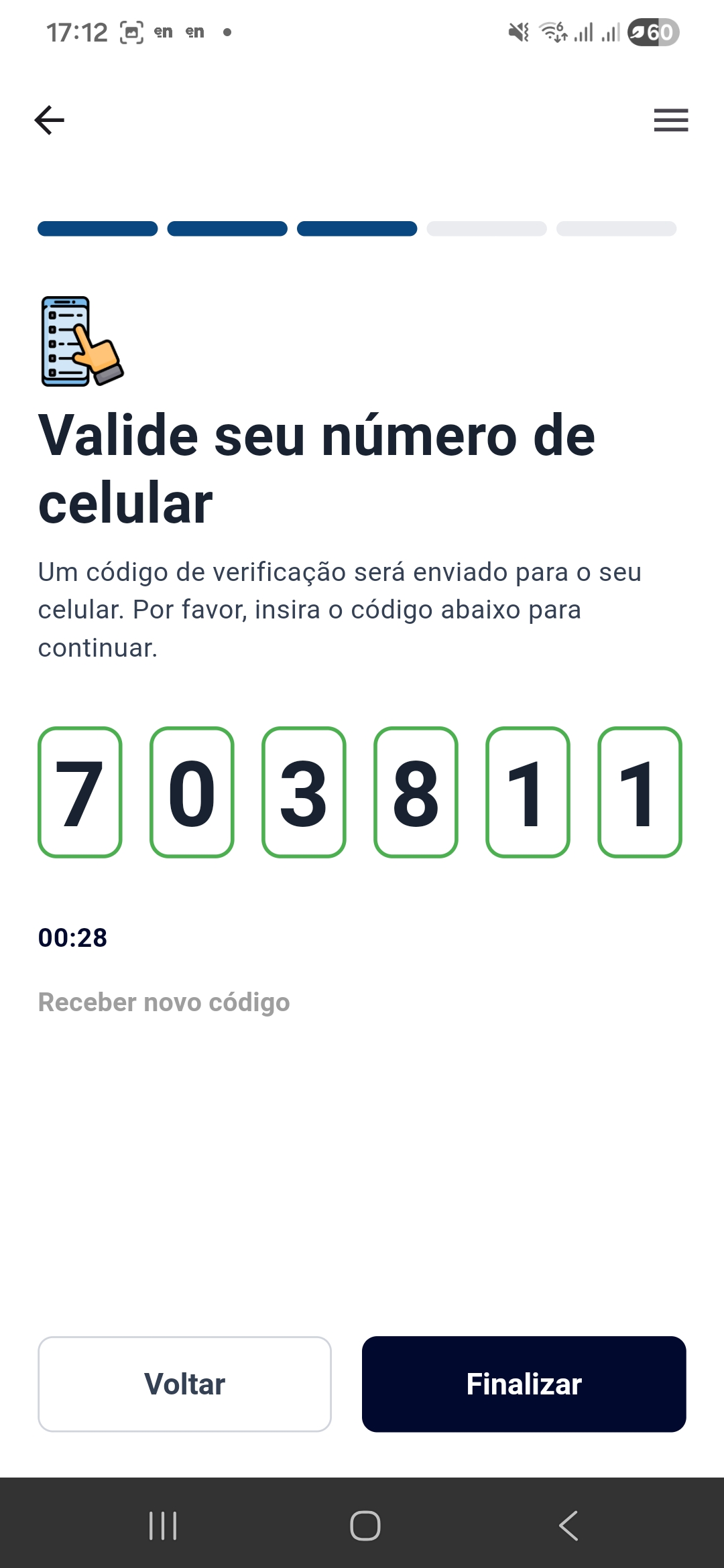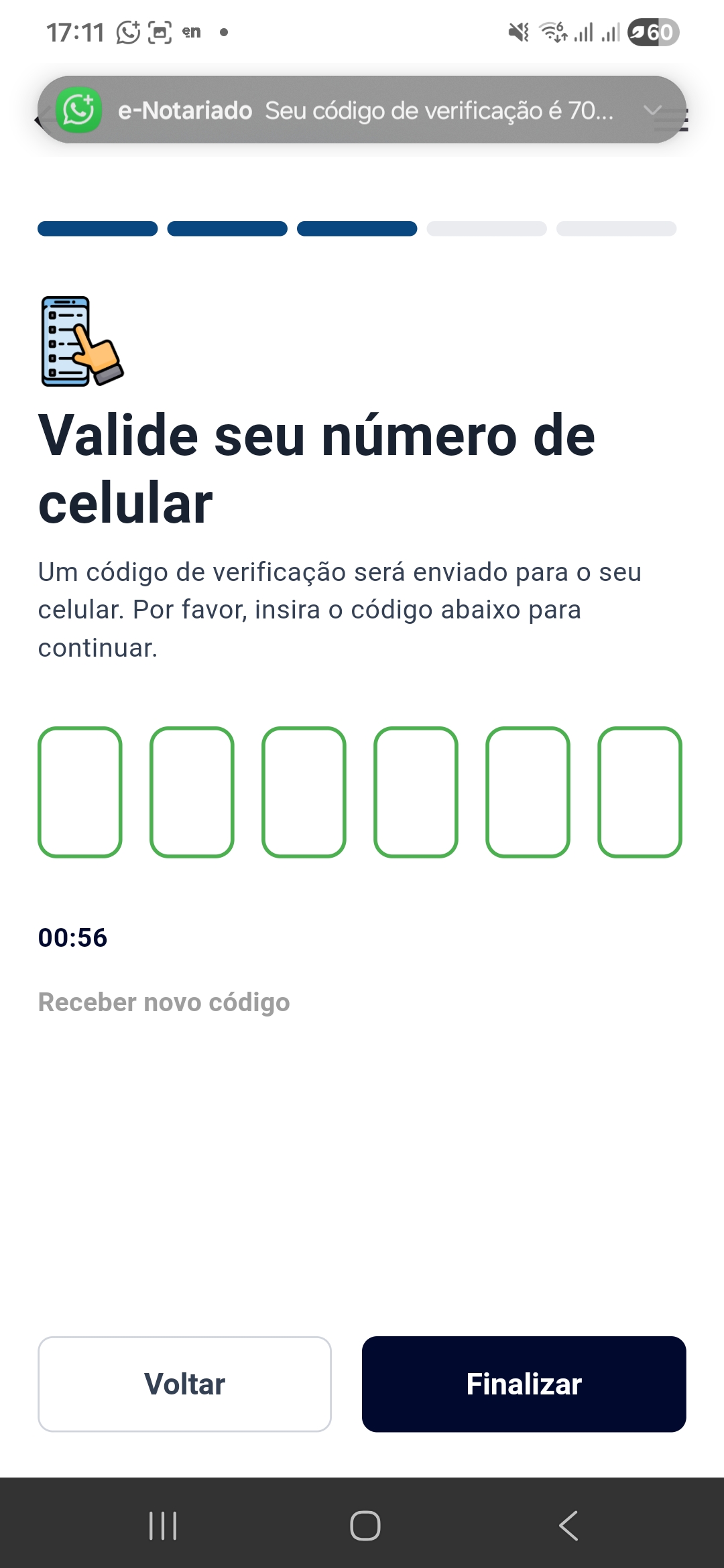 Aguarde pelo recebimento do código de verificação por WhatsApp ou SMS.![]() | Assim que receber o código de verificação, informe na tela e clique em 'Finalizar'.![]() |