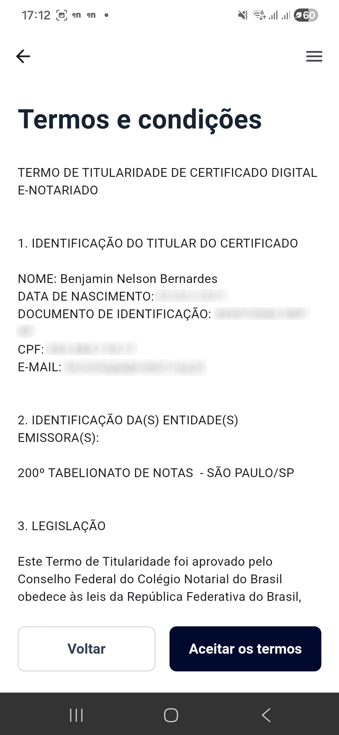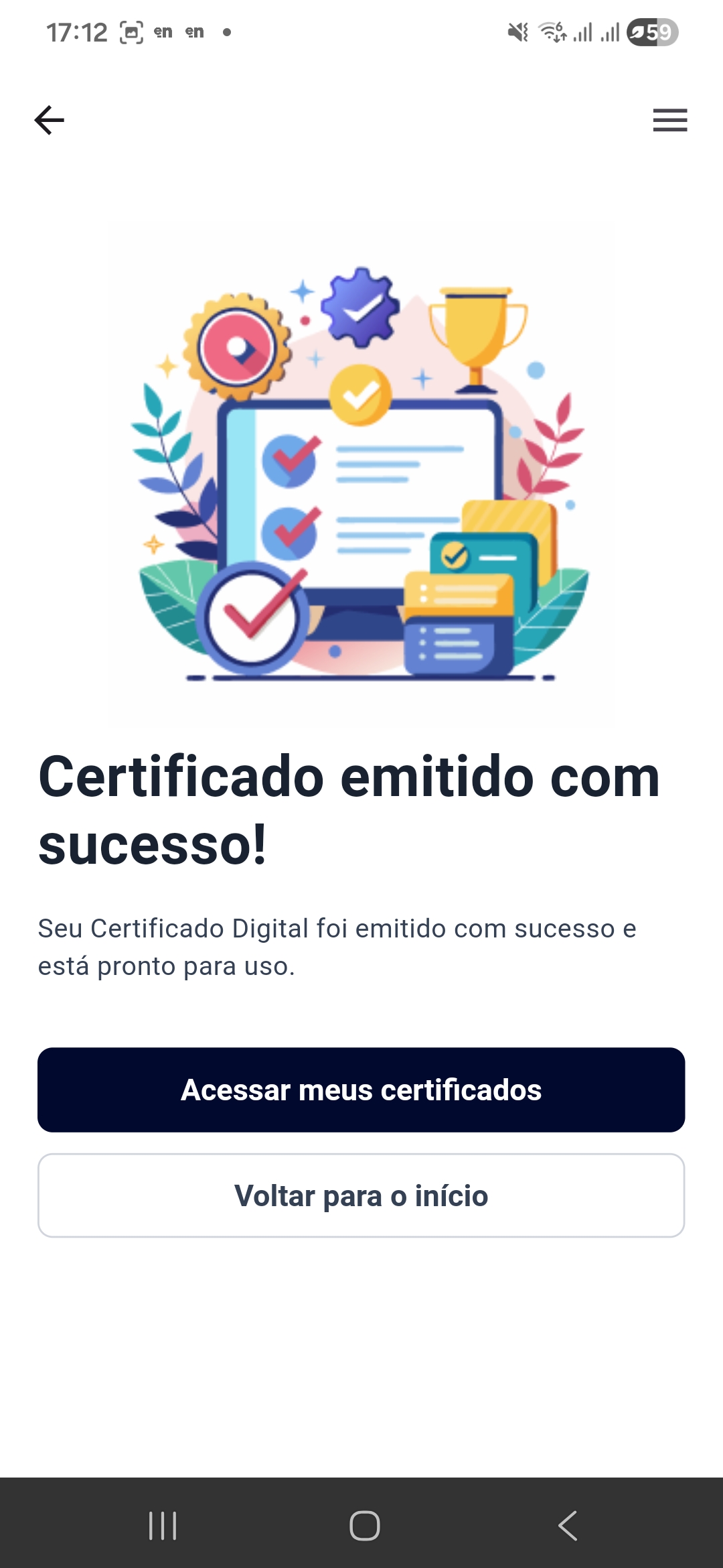 Aceite o termo de titularidade de seu certificado digital notarizado.![]() | Seu certificado foi emitido! Para consultar, clique em 'Acessar meus certificados'![]() |