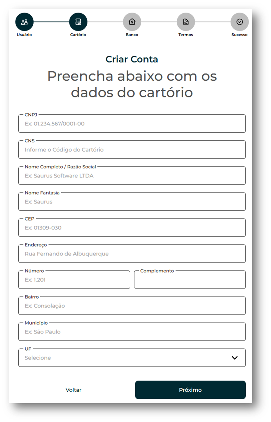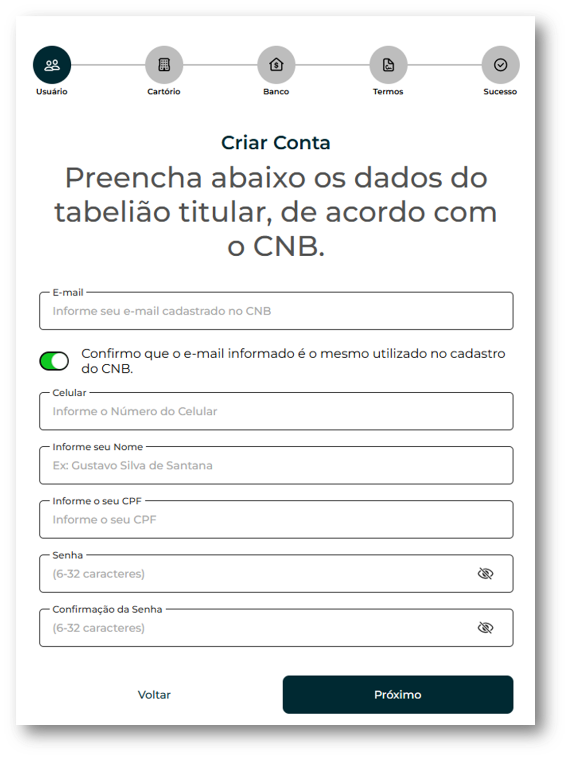 Informe exclusivamente os dados do Tabelião titular. Como o acesso ao sistema é realizado com e-mail e senha, é imprescindível que seja o individual do tabelião e não genérico, tais como, "financeiro@", "atendimento@", "contato@". O tabelião depois poderá incluir seus prepostos no sistema.