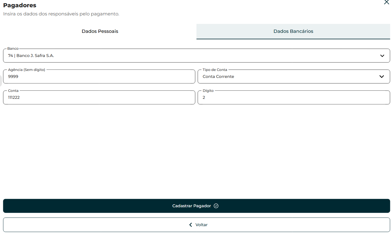 Informe a conta bancária do comprador para eventual devolução dos valores pagos, em caso de descumprimento das condições do negócio. Depois clique em "Cadastrar Pagador".