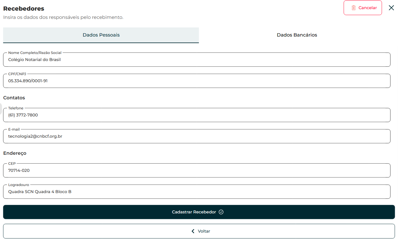 O sistema apresentará os dados do recebedor informado. Poderá adicionar novos recebedores também nesta operação. Para isto, clique em "Adicionar Recebedor" ou avance para a próxima etapa, clicando em "Próximo".