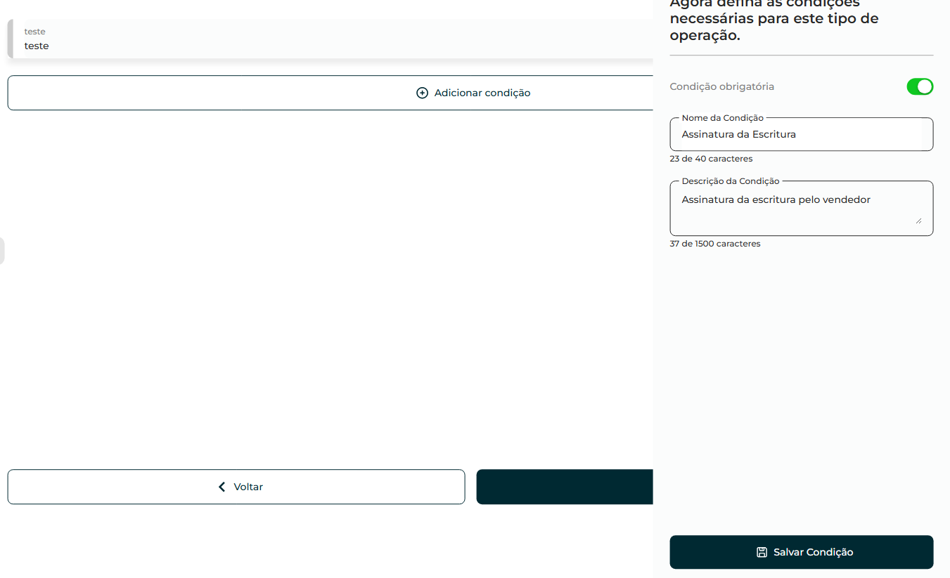 O sistema apresentará as condições previamente definidas no sistema. Além disto, poderá acrescentar outras condições na operação.