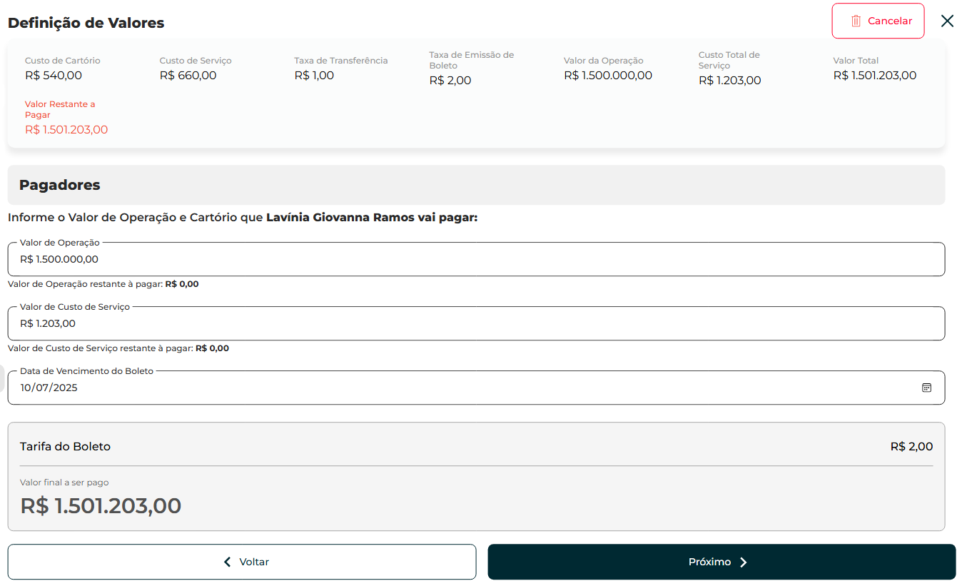O sistema apresentará os valores a pagar pelo comprador, com os devidos repasses. Informe a data de vencimento do boleto e clique em "Próximo".