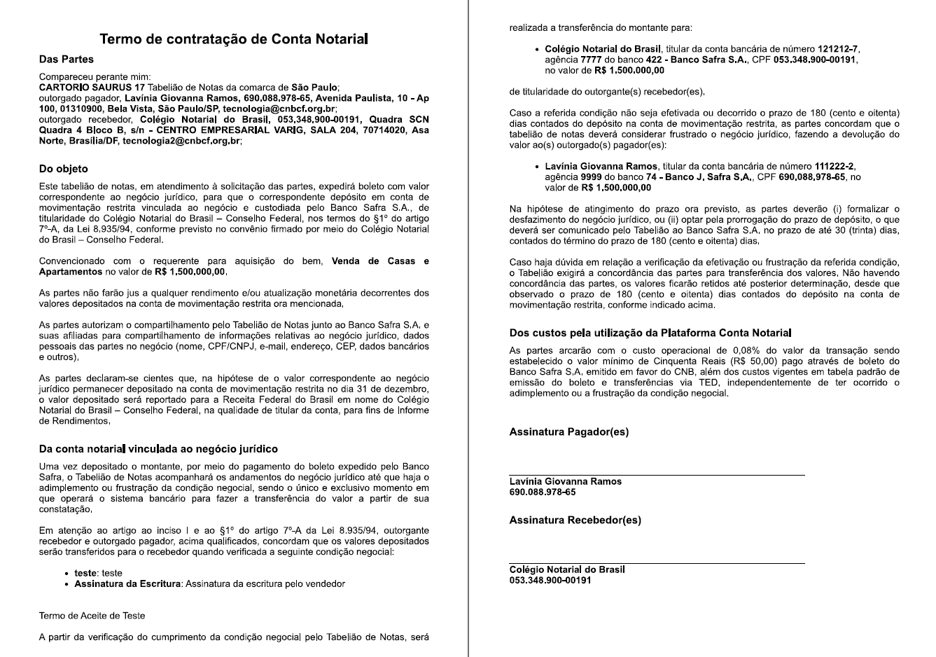 Baixa o termo da contratação da Conta Notarial e solicite as assinaturas digitais ou físicas do comprador e vendedor. Depois, anexe a versão assinada nesta etapa e clique em "Concluir".