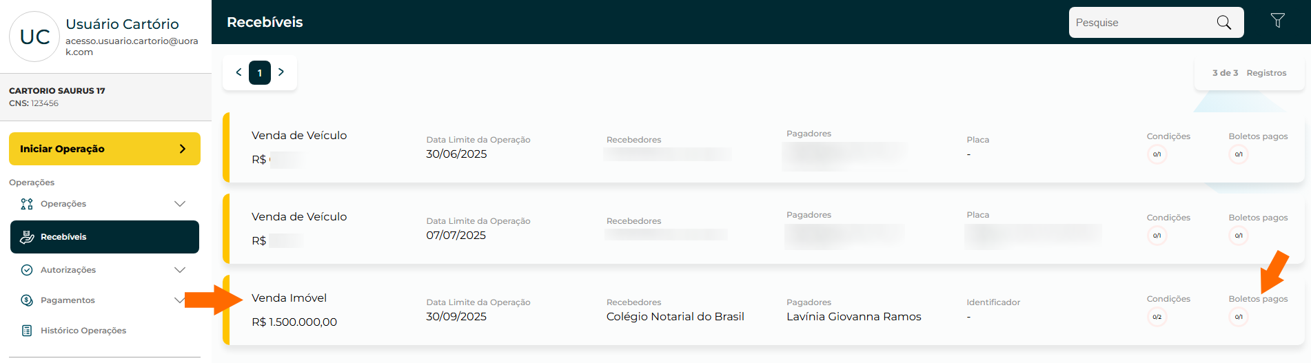 Na opção "Autorizações", o usuário do cartório com perfil de Administrador deve analisar as operações pré-autorizadas e confirmar a autorização do pagamento de todos os envolvidos.