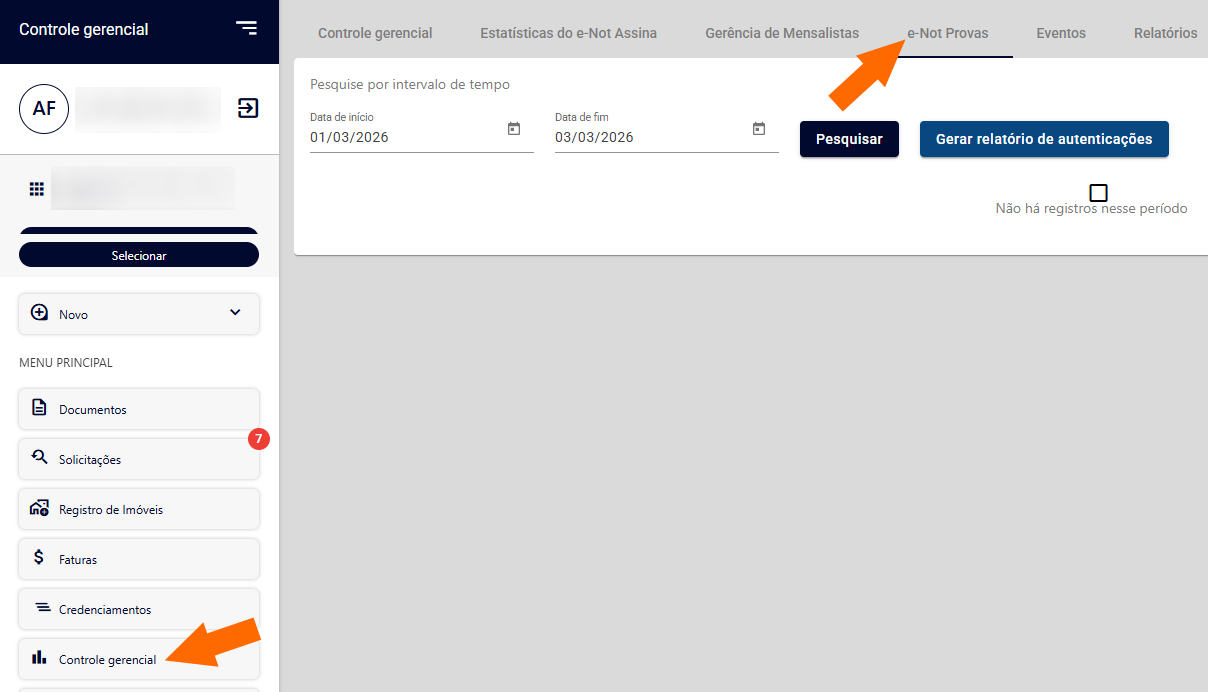Para o controle das autenticações digitais do e-Not Provas, o cartório poderá extrair uma posição no Controle Gerencial do Fluxo de Assinaturas.