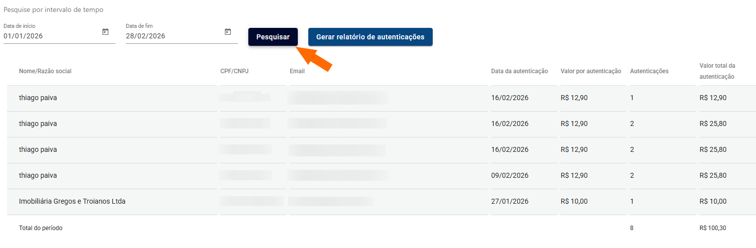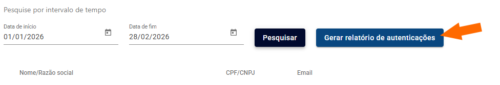 Para exportar uma planilha Excel com todas as autenticações digitais do período informado, clique em 'Gerar relatório de autenticações'.